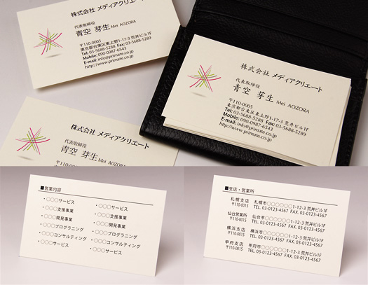 | 文字名刺にワンポイント加えたカラー名刺。ワンポイントの存在感で好印象。ビジネスシーンでお使いいただくには最適です。 |